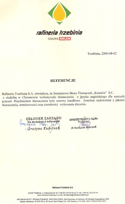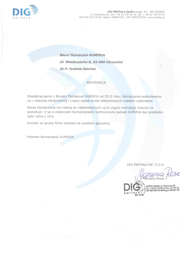 „Wyrażając nasze zadowolenie z dotychczasowej współpracy z Biurem Tłumaczeń KUMIRIA, chcielibyśmy polecić je wszystkim zainteresowanym usługami tłumaczeniowymi.”