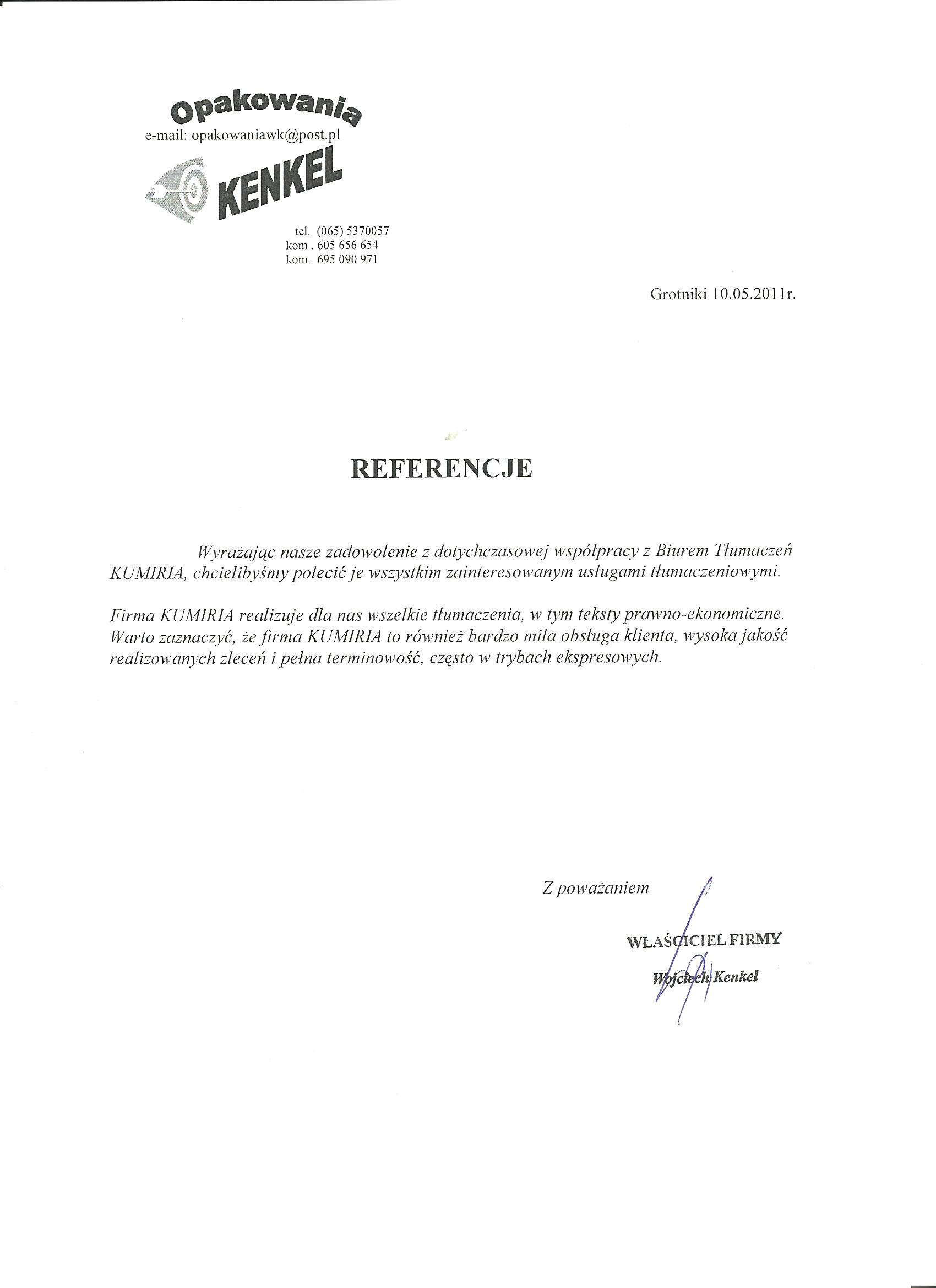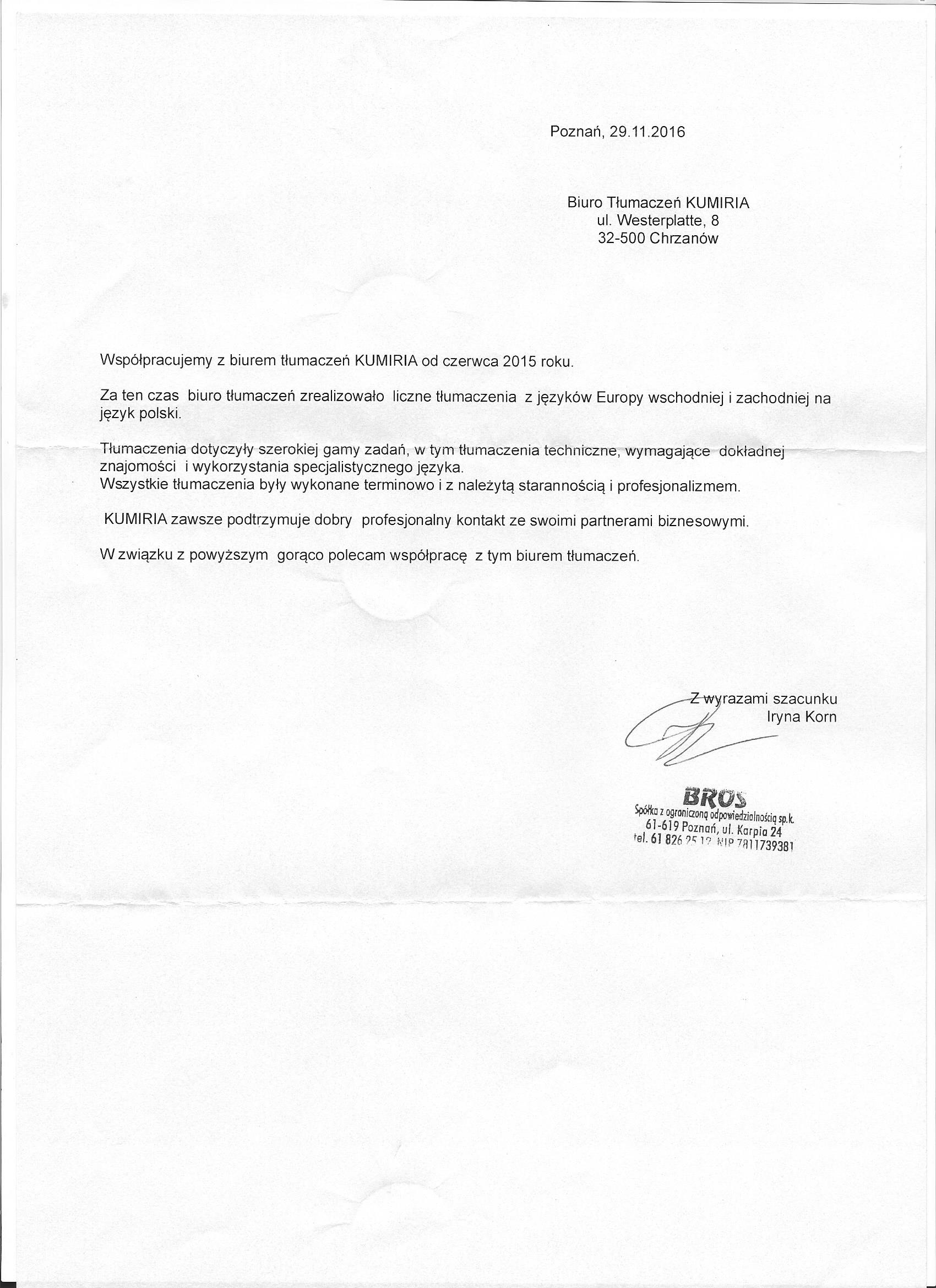 List referencyjny dot. firmy Biuro Tłumaczeń „Kumiria”